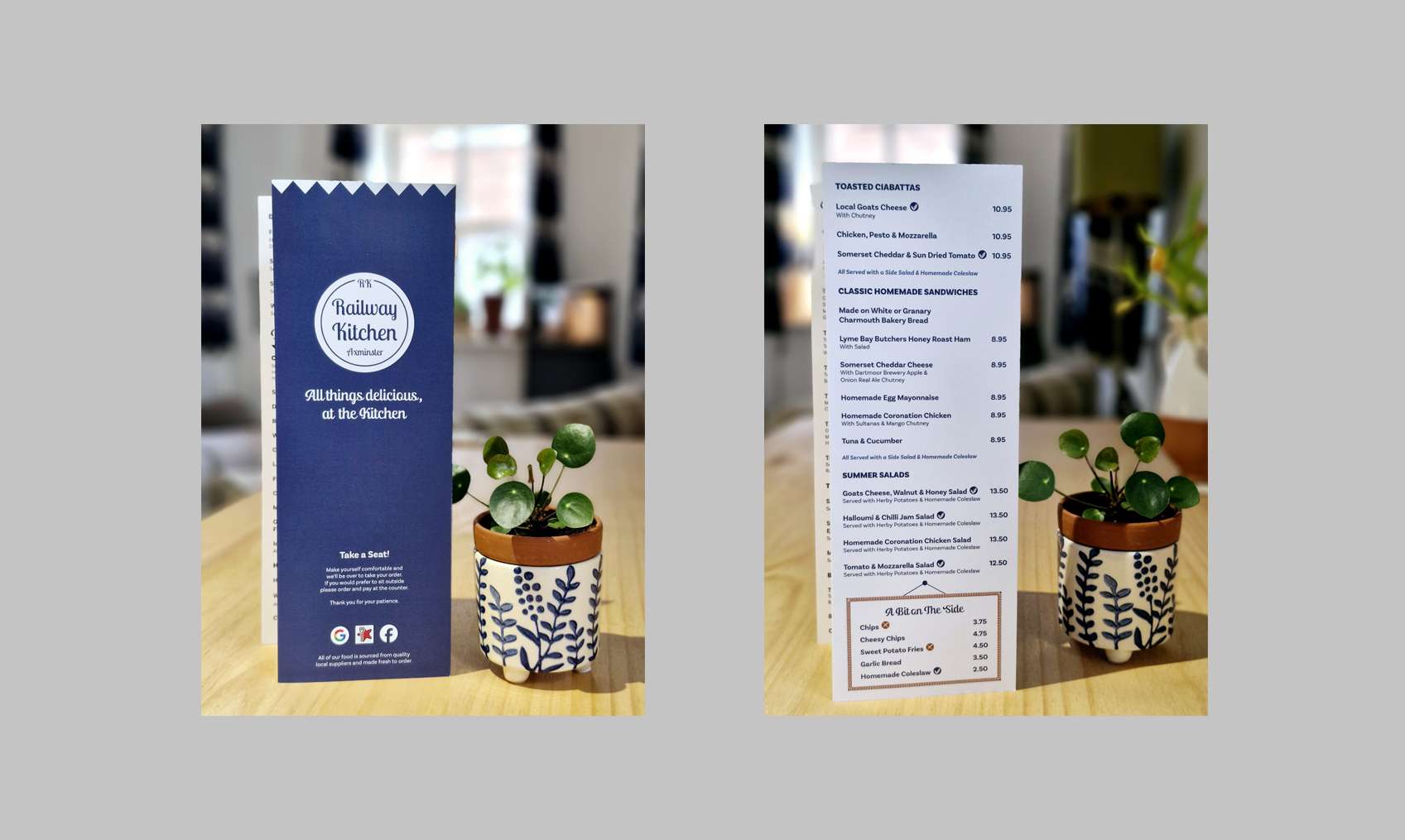 We used the darker blue of the logo to keep the brand consistent. The double-folded design accommodated their extensive menu offering, whilst the height and narrow width allowed for maximum space and some added personality on the small tables.